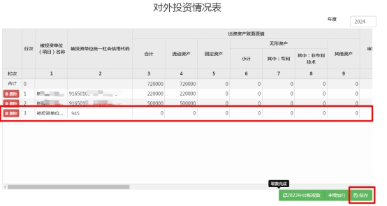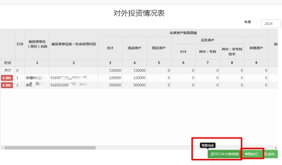 2.当年新增,点击右下角【增加行】按钮,在行次中填写具体被投资单位、统一社会信用代码等信息。填报完成后点击右下角【保存】。