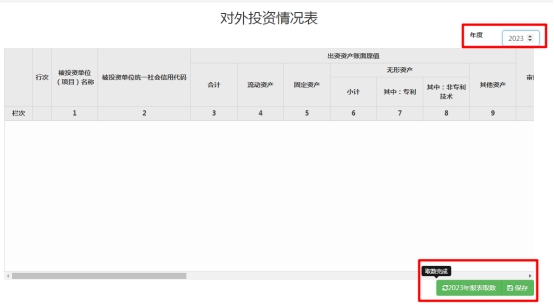 3.补录以前年度信息,如2023年,在资产年报对外投资情况表中填写过2023年对外投资情况的,点击对外投资情况表右上角,将年度调整至【2023】,点击右下角【2023年台账取数】后,点击保存。