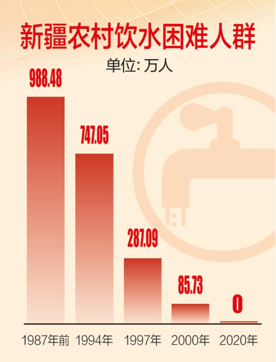 伴随着这一工程的完工,新疆所有贫困人口彻底告别苦咸水,全面实现饮水安全。“十三五”期间,新疆累计投资132亿元,实施农村饮水安全巩固提升项目400多项,累计解决和巩固提升152万贫困人口饮水安全问题,为全区打赢脱贫攻坚战、接续推进乡村振兴奠定了坚实的水利支撑。