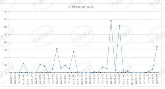 2025年1-6月,新疆维吾尔自治区地方政府专项债券发行额为619亿元,同比增长225.79%,占全国地方政府专项债发行总额的1.41%,在全国37个省(区、市)中排第25名(见图5),其中新增专项债发行额为403亿元,占到专项债券发行总额的78.46%。从2023-2024年专项债发行情况来看,重点月份主要集中在6-9月(见图6)。2025年7-9月预计也是新疆专项债发行的高发期。