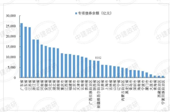 截止到2025年6月末,新疆维吾尔自治区地方政府专项债券余额为8102亿元,占到全国地方政府专项债券余额的2.33%,在全国36个省(区、市)中排第20名(见图4),总体规模偏低。