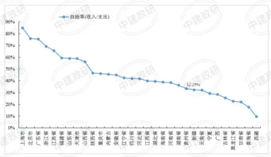 2024年新疆维吾尔自治区一般公共预算收入2409亿元,公共预算支出为7469.11亿元,财政自给率为32.25%(见图10),处于全国中下游水平,财政自给率高于30%的风险线。