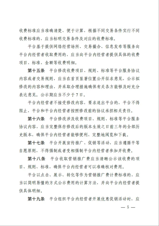 7月31日,市场监管总局发布并施行《网络交易平台收费行为合规指南》(以下简称《指南》),进一步规范网络交易平台向平台内经营者收取佣金、抽成、会员费、技术服务费、信息服务费、营销推广费等收费行为。