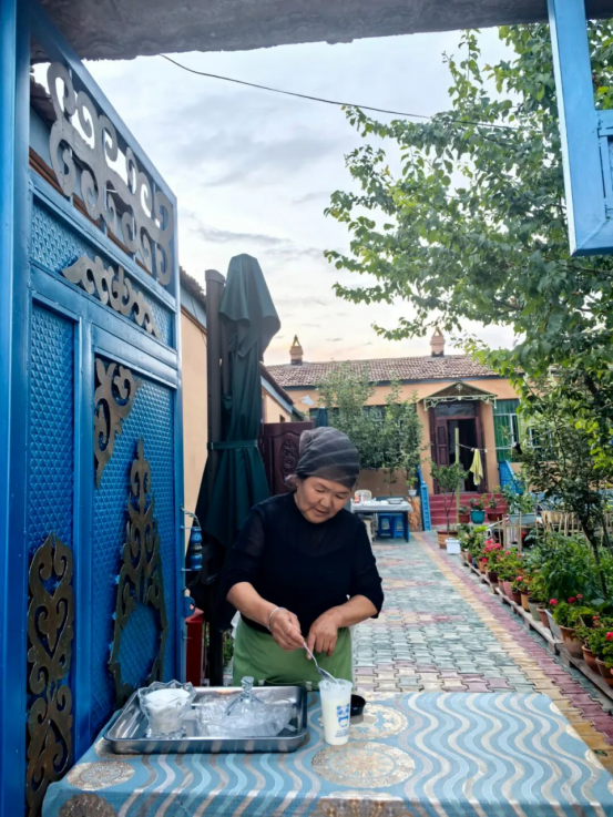 55岁的哈萨克族大姐古拉依在特克斯县离街生活了20多年,谈起如今的生活,她满是感激:“街道改造前,房屋破旧不堪。现在院墙加厚了、刷上了漂亮的彩漆,屋里还装上了暖气和下水道。”古拉依每天在自家小院门口支起摊位,她做的手工酸奶深受游客喜爱,“日子从没这么好过,感谢党和政府的好政策!”