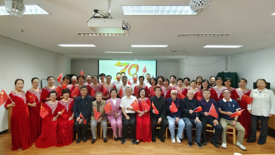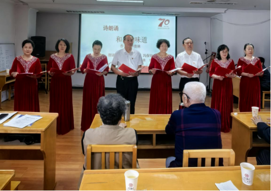 在中华人民共和国成立76周年和新疆维吾尔自治区成立70周年来临之际,合唱团和朗诵组以“银龄心声颂党恩”为题,用合唱、诗朗诵的形式,将现场气氛推向高潮。当《红旗颂》《永远跟党走》等红色歌曲旋律在会场唱响;《看新疆》《和平的味道》《读中国》《月光下的中国》在抑扬顿挫声中缓缓道来,当全场挥动手中国旗同时高唱《歌唱祖国》时老同志的眼里闪着激动的泪花,大家充分感受到中国共产党的伟大、中华人民共和国的强盛和在党的领导下在以习近平同志为核心的党中央确定的新疆工作总目标指导下,新疆大地发生的翻天覆地巨大变化。