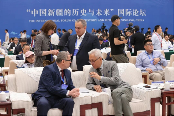 2024年6月12日,“中国新疆的历史与未来”国际论坛在新疆维吾尔自治区喀什市举办,论坛由中央民族大学、北京大学和喀什大学联合主办,新疆大学、新疆师范大学协办。来自中国、美国、澳大利亚、德国、意大利、匈牙利、埃及、俄罗斯、蒙古国、哈萨克斯坦、乌兹别克斯坦等国家的100余名专家,围绕中国新疆的历史与未来相关议题展开深入研讨。图为嘉宾在开幕式前交流。