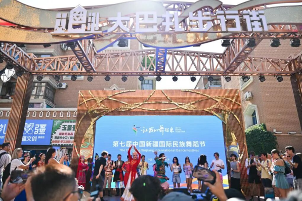 2025年7月22日,在乌鲁木齐新疆国际大巴扎,意大利米兰芭蕾舞团的演员与新疆民族舞蹈演员共舞。新华社记者辛悦卫摄